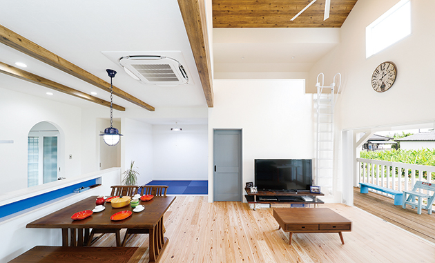 鮮やかなマリンブルーの玄関と軒先きに温かな光を灯すマリンランプ。実は、このランプもご主人のイメージに近づけるため青く塗装したというこだわりよう。〝家族の一番心地よい場所でありたい〟と願うリビングは、柔らかなスギの無垢材が張られた22・5帖の広々空間。リビングからつながる贅沢なほど広いウッドデッキが、より一層空間を広く感じさせてくれます。各部屋の建具の色をすべて変えたり、天井の梁部分には不燃認定の木目クロスを張るなど、防火基準を満たしつつ遊び心もある魅力的な空間に仕上がっています。