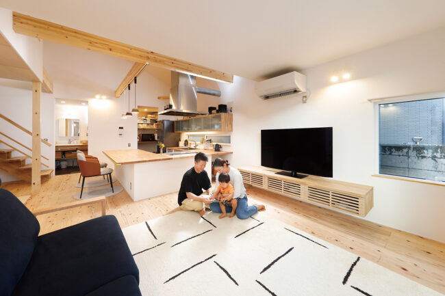 隣家が近い住宅地のため、採光性やプライバシーを確保しながら、伸びやかな暮らしをかなえることがH邸のミッション。そこで同社は、家族が憩う1階に吹き抜けを設けました。玄関ホールから室内に入ってすぐに開放的な空間が出迎えてくれる仕掛け。これだけ広々としているのに、エアコン1台で快適室温をかなえられるのは、住宅性能の高さの現れといえるでしょう。