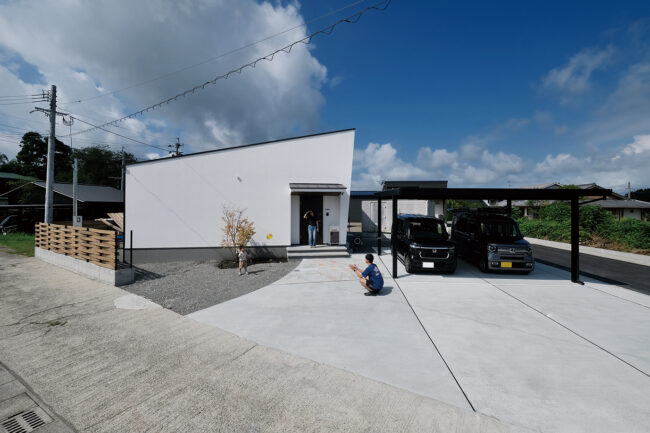 美術館のような外観は、「Sto(シュトー)」の白い塗り壁が青空によく映えます。真南のリビングには外付けブラインド「ヴァレーマ」を設置し、日射をコントロール。パッシブ設計で自然光を取り込みながら室温上昇を抑えています。室内はマシュマロタッチの柔らかな質感に包まれ、板張りの天井や無垢床が温もりと奥行きを演出。SW(スーパーウォール)工法と熱交換型換気システムにより、エアコン1台で家全体が快適です。「空気がさらりとしていて、食器や洗濯物、髪の毛まで乾きが早い。今から冬が楽しみです」。洗濯動線は一カ所に集約し、収納も使いやすく配置。クリーンな空気とちょうどいい温湿度がスマートな暮らしを支えます。