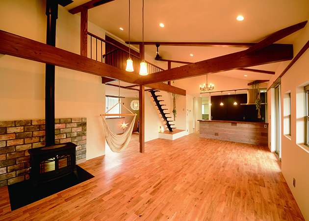 見学会に訪れたお客様が思わず口にするのは、「カッコいい」という感嘆の言葉。ウッドデッキが迎える木の家には、薪ストーブ、ハンモック、オリジナルの階段、ロフト、黒板塗料のキッチン収納など、暮らしのアイデアと心地のいい居場所がたくさん詰まっています。デザイン性と機能性を両立させた家に、住まい手の個性が高い次元で融合した住まい。手掛けたのは出水市に拠点を置き、地元の設計士や大工、デザイナーなど気鋭のクリエイターたちが集うSTYLE HOUSE。提案するのは、暮らしに遊び心をプラスした自分スタイルの家。代表の新屋さんは「STYLE HOUSEをひとつのツールとして、それぞれのライフスタイルに合わせた様々な暮らしのカタチをかなえて欲しい」と話します。