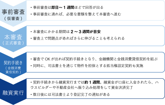 注意したいのは融資実行までにかかる時間。金融機関の手続き方法にもよりますが、事前審査から融資実行まで、スムーズにいっても1~2ヵ月を要します。