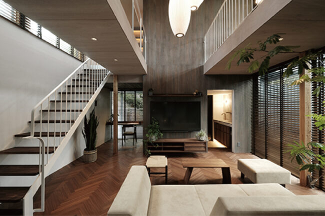 室内に入れば、大きな吹き抜けのあるリビング空間広がっている。アイアンの軽やかな階段や、2階の渡り廊下は日々の暮らしにリズミカルな喜びと動きをもたらし、ヘリンボーン柄の床材は素足に心地よい。暮らしを包み込む壁材はスモーキーなトーンで統一。大きな垂れ壁や袖壁は空間と時間をほどよく仕切る、暮らしのアクセントとなっている。